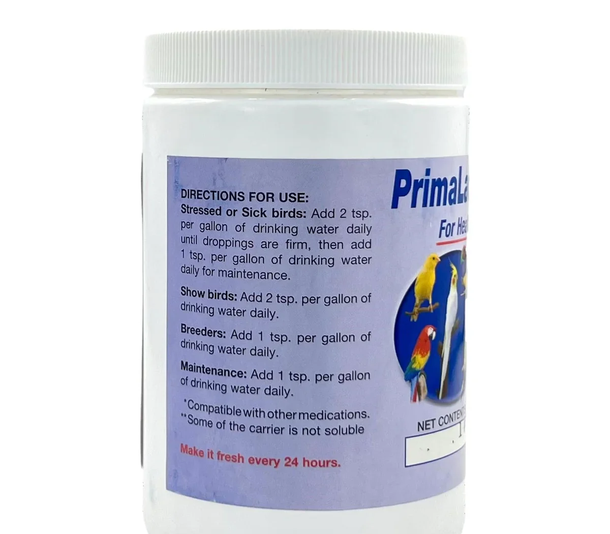 Recomendado por veterinarios como fuente suplementaria de bacterias beneficiosas para ayudar en la recuperación del estrés causado por factores ambientales como E. coli y Salmonella en aves enjauladas.